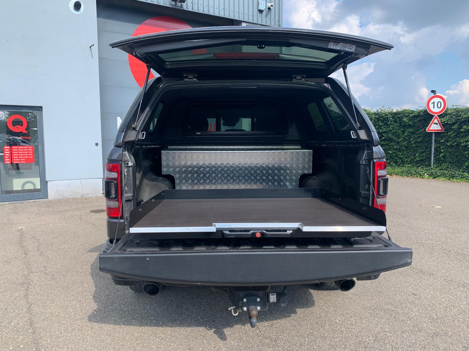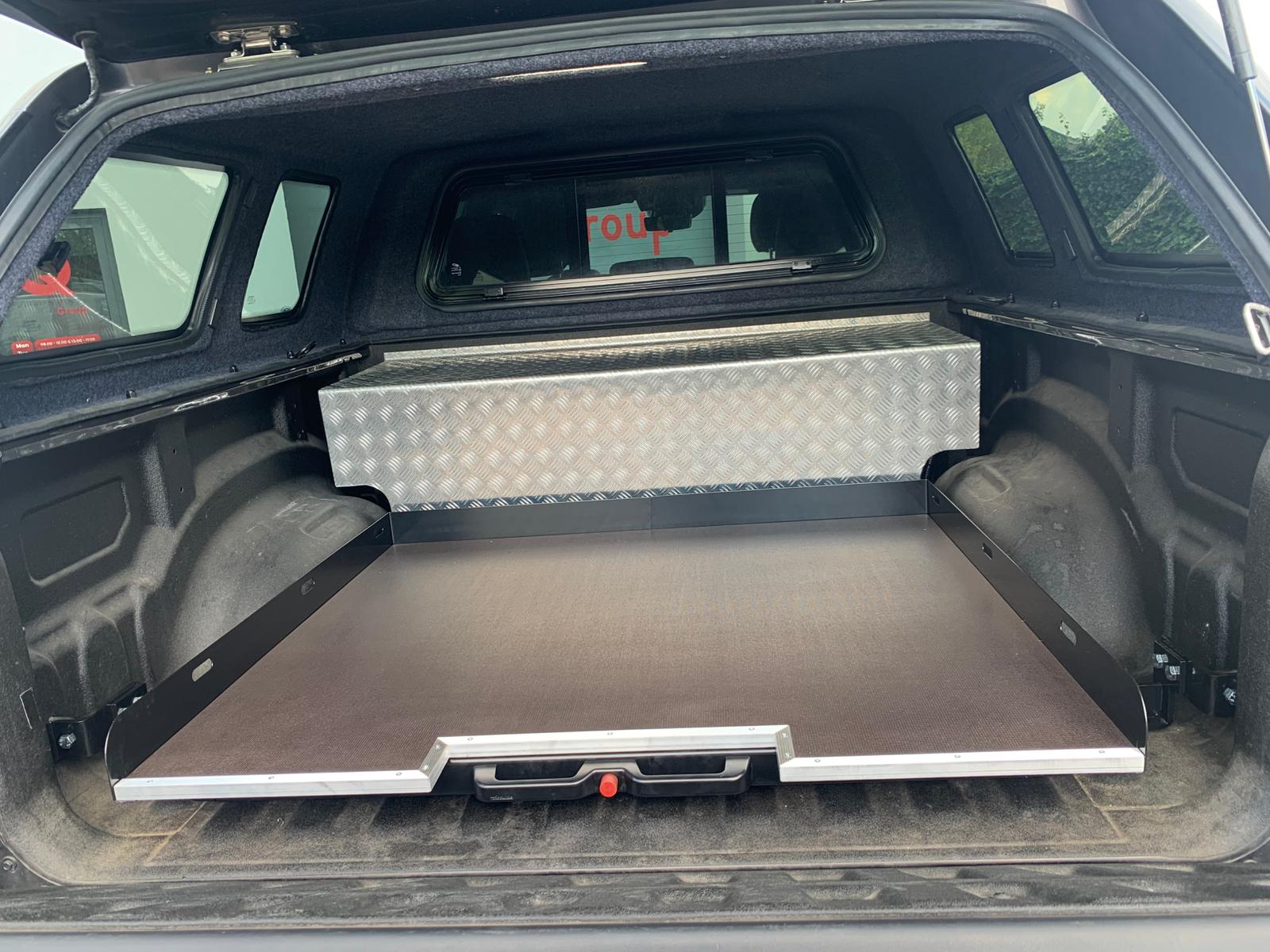 Deze Dodge Ram werd uitgerust met uitschuifbare lade of bedslide genoemd. Is een eigen ontwikkeld product onder Q-Acces en heeft het uniek kenmerk dat wanneer de bedslide volledig is uitgeschoven is, hij nog steeds een draagkracht heeft van 250kg. Verder beschikt hij nog over een anti slip laag in composiet. We hebben deze bedslide beschikbaar voor diverse types Pick-Up.