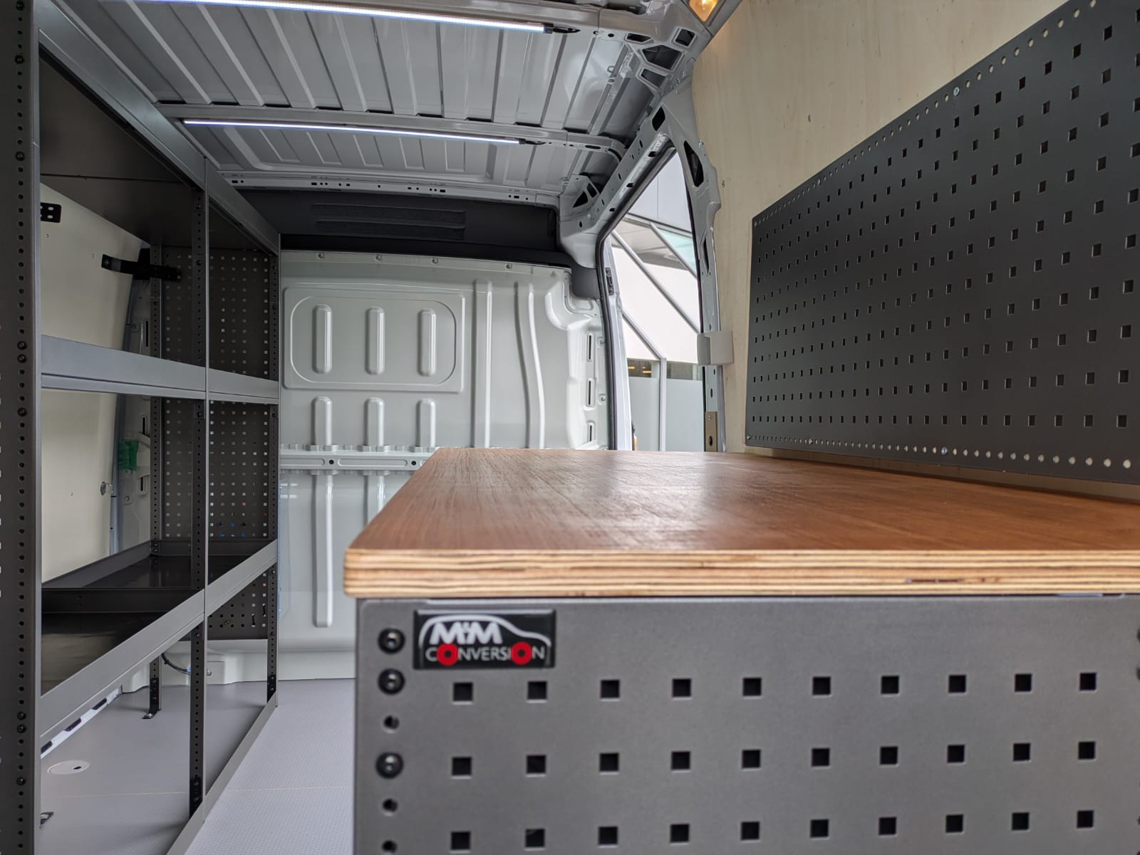 Deze bestelwagen werd voorzien van een hexaline grijskleurige vloer in combinatie met multi-8mm zijwanden. Daarnaast werd de bestelwagen ingericht met een inrichting van BOB-SYSTEM op maat voor de klant in combinatie met een werktafel. Ook werd de bestelwagen voorzien met ledverlichting over de volledige laadruimte en een omvormer van Victron.