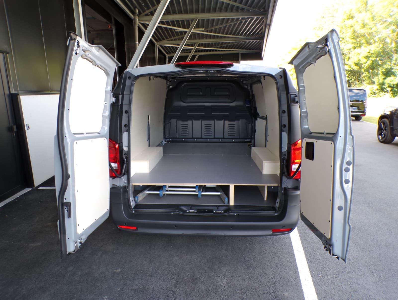 Deze Mercedes Benz Vito Mixto uitvoering werd voorzien van een dubbele laadvloer in de laadruimte. Vloer is een hexaline grijze vloer 12 mm met zijwandbekleding multiplex 8 mm in combinatie met wielkastbescherming.